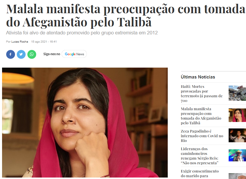 A Nobel da Paz Malala Yousafzai manifestou sua preocupação com o que acontecerá com as minorias do Afeganistão com a volta do Talibã. Ela não é afegã, mas paquistanesa. Ainda assim, foi vítima de um atentado realizado pelo Talibã em 2012, um tiro na cabeça ao voltar da escola de ônibus. Seu crime: defender o direito das meninas à educação. A primeira prefeita mulher no Afeganistão, Zarifa Ghafari, já avisou q o Talibã vai matá-la. Uma das notícias mais comentadas foi a de professores e professoras se despedindo das alunas universitárias, sem saber o dia da amanhã.