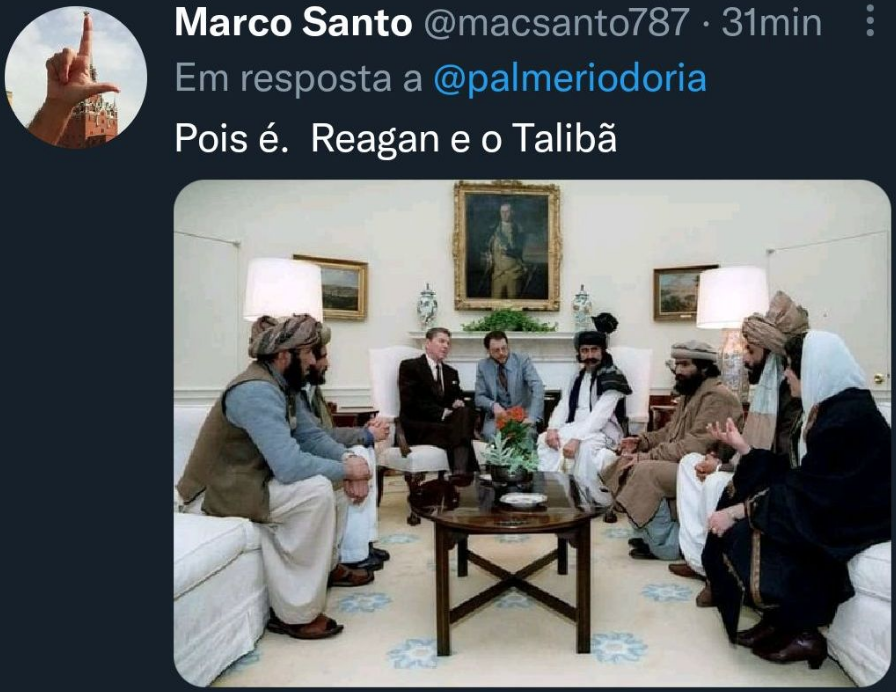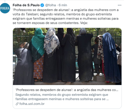 Um porta-voz do Talibá já prometeu: “Na nossa sharia é claro: para quem tem relações sexuais e não é casado, a pena é de 100 chicotadas em público. Quem rouba deve ter as mãos cortadas”. E: “Se não renunciarem à cultura ocidental, teremos que matá-los”. Como alguém, de esquerda ou de direita, pode comemorar a vitória de um grupo fundamentalista? Ponham-se no lugar das meninas, mulheres e LGBT do Afeganistão. É puro Gilead.