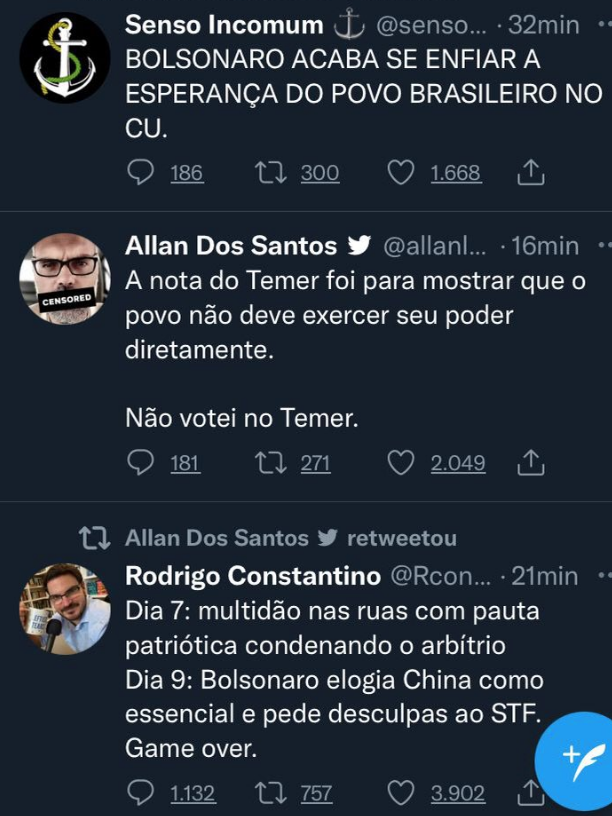 Mas calma que ainda pode piorar! Pouco depois ficamos sabendo que a carta não foi escrita por Bolso, mas por outro golpista, o ex-presidente Temer! Isso foi um pouco demais até para os seguidores mais fanáticos de Bolso, que neste momento estão desesperados, envergonhados, arrependidos, procurando uma quarta via.