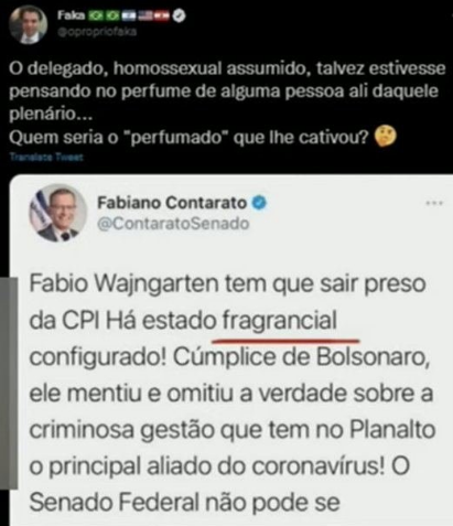 O empresário bolsonarista Otávio Fakhoury foi chamado para depor porque é acusado de patrocinar bolsominions para espalhar conteúdo negacionista sobre a pandemia, além de discurso de ódio e atos antidemocráticos. Contarato chamou a atenção de Fakhoury porque, em maio, o senador errou a grafia num tuíte, escrevendo “estado fragrancial”, em vez de “flagrancial”, e o empresário, homofóbico como todo bolsonarista, aproveitou para tuitar: “O delegado [Contarato foi delegado da Polícia Civil antes de ser eleito senador], homossexual assumido, talvez estivesse pensando no perfume de alguma pessoa ali daquele plenário… Quem seria o ‘perfumado’ que lhe cativou?”