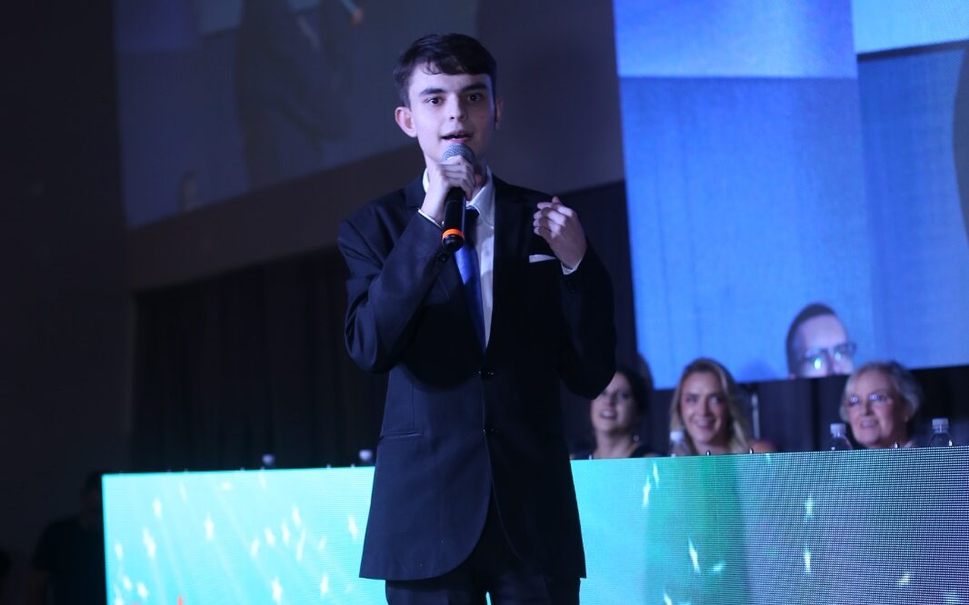 A cerimônia de formatura do Colégio Almeida Júnior, realizada na noite de sábado (13), foi marcada por um momento especial e carregado de emoção. O aluno formando do Ensino Médio, Gabriel Lonardi Schwarz protagonizou uma apresentação musical durante o evento ao interpretar a canção “A Paz”, do grupo Roupa Nova, em homenagem à direção, coordenação, professores e colegas de escola.