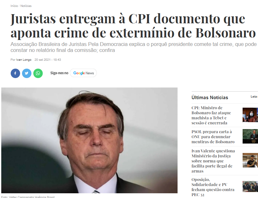 Ontembol2Bco2Bdocumento a Associação Brasileira de Juristas pela Democracia (criada em maio de 2018, hoje conta com quase 2 mil associados, entre juízes, desembargadores, advogados, defensores públicos, professores, servidores do sistema de justiça, promotores, procuradores estaduais e municipais, e estudantes de direito) entregou à CPI da Covid um documento  tipificando o crime de extermínio cometido por Jair Bolsonaro.