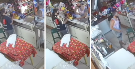 Como se vê num vídeo , ele jogou o que estava no balcão em cima dela. Em seguida, foi entrando no balcão. Adriana saiu, enquanto pedia ajuda no celular. Márcio lhe deu uma rasteira e ela caiu. Quando tentou se levantar, Márcio a chutou e quebrou o braço dela.