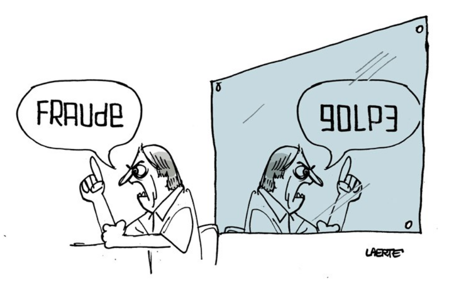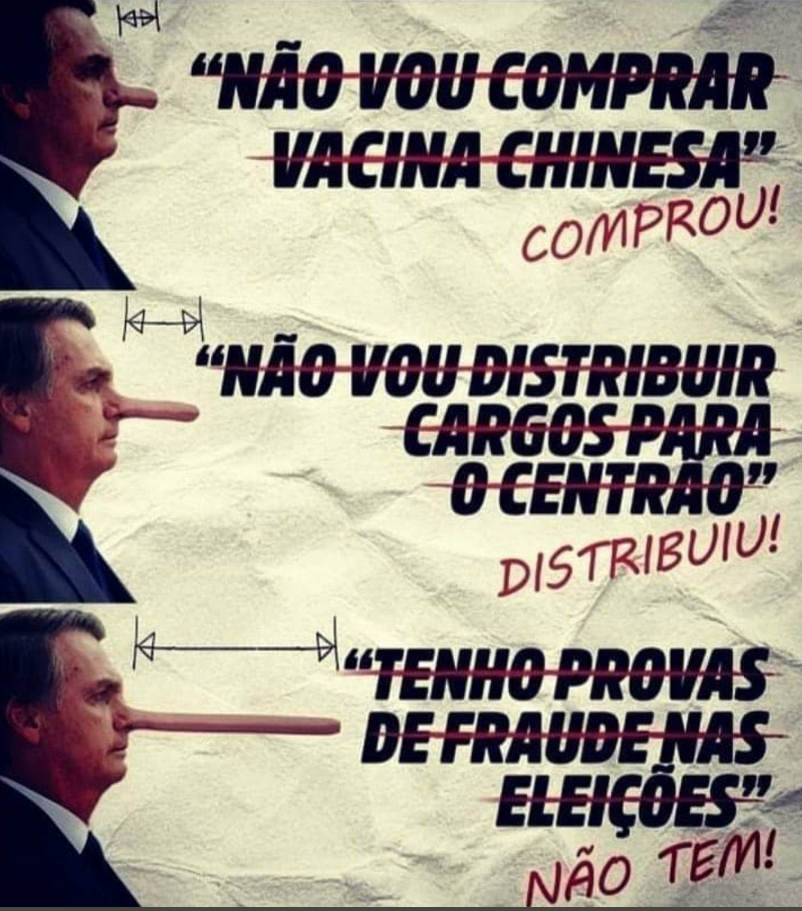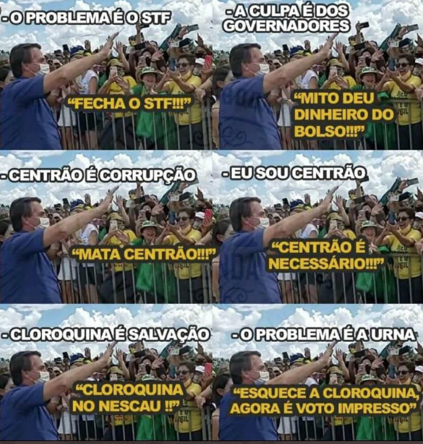 Engraçado está sendo ver o mascote número 1 de Bolso (ou seria o Aras?) falar “vamos virar a página, Bolsonaro vai aceitar o resultado da Câmara”, enquanto o genocida não para. Hoje no cercadinho ele repetiu três vezes “Não tenho provas”, depois de contar todas aquelas mentiras conspiratórias (países de esquerda e o Foro de SP pagaram um hacker pra roubar 12 milhões de votos dele nas urnas eletrônicas etc).