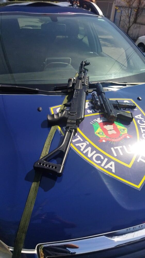 A guarnição então promoveu buscas e encontrou o suspeito, que apresentava sinais de embriaguez, na posse de um simulacro de uma AK-47 e outro simulacro de submetralhadora.