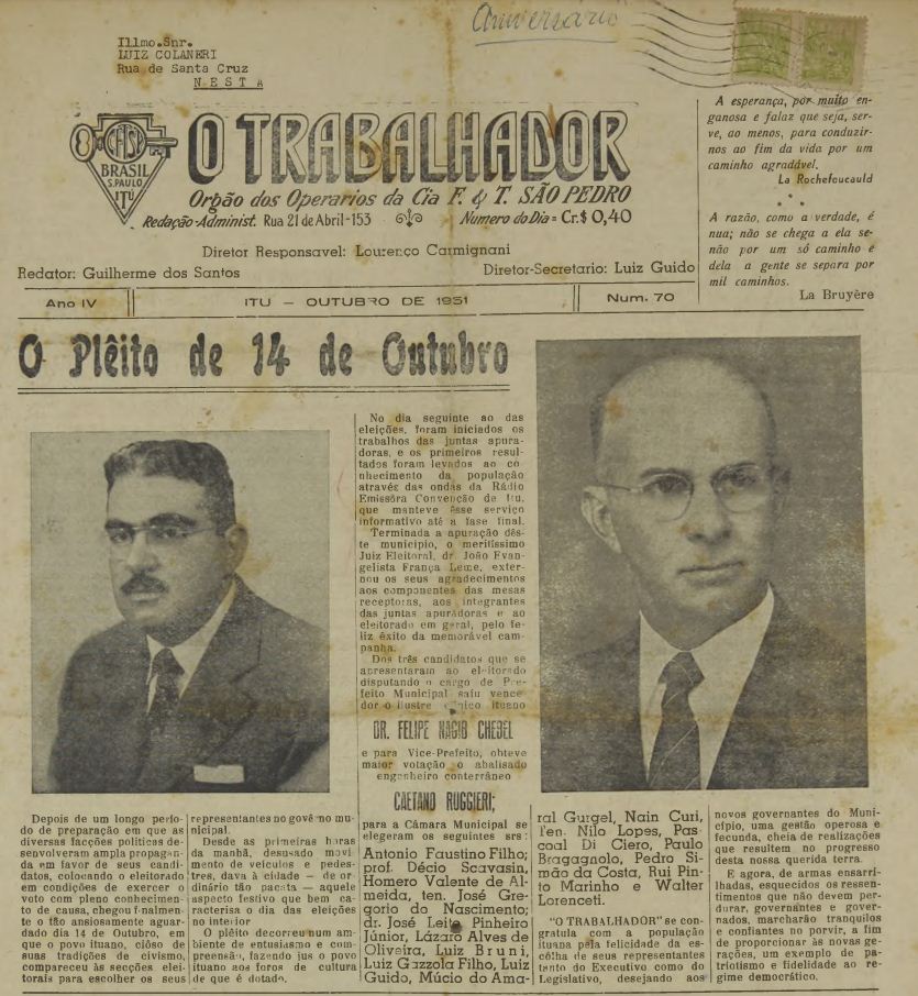 Em homenagem ao Dia do Trabalhador, celebrado no último dia 1º de maio, o Museu Republicano “Convenção de Itu” selecionou exemplares do jornal “O Trabalhador”, órgão dos operários da Companhia de Fiação e Tecelagem São Pedro, importante indústria do ramo têxtil que operou em Itu no século XX, iniciando sua produção em 1911. A publicação era dirigida pelo professor Lourenço Carmignani e contava também com Guilherme Santos na redação e Luiz Guido na secretaria. A Coleção de Jornais Ituanos dos séculos XIX e XX, guardada na Biblioteca do Museu Republicano, possui cinco exemplares do periódico, que estão disponíveis online na BORE (Biblioteca de Obras Raras e Especiais da USP) e podem ser acessados em bit.ly/o-trabalhador.