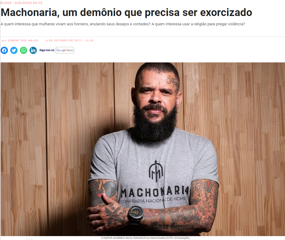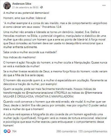 Recentemente, o pastor brasiliense Anderson Silva escreveu nas redes sociais que a mulher tem um ‘potencial demoníaco’. Segundo ele, a sociedade olha apenas para a agressão que um homem comete contra uma mulher, mas não para os meses de tortura psicológica ao quais a mulher supostamente submeteria o homem.