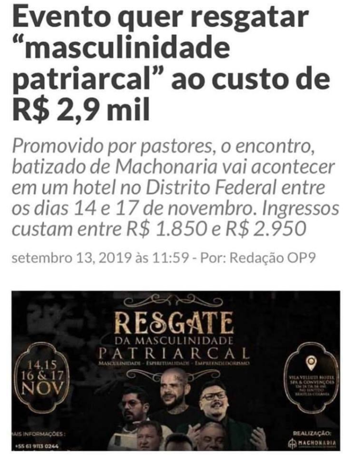 Silva, que tem centenas de milhares de seguidores nas redes sociais, é idealizador de projeto chamado Machonaria, que busca resgatar os valores patriarcais na sociedade. Esse tipo de postagem não é raridade. Tenho visto dezenas de perfis que discursam sobre uma masculinidade violenta, que submete mulheres à vontade de homens a custo da integridade emocional e física de suas esposas. Esses perfis falam que mulheres são obrigadas a fazer sexo com seus maridos, mesmo sem vontade; que o fato de querer ter filhos é uma decisão do casal e não da mulher – a partir da ideia de que, para por DIU ou usar anticoncepcionais a mulher deve ter, primeiro, a permissão do marido; de que o dever da mulher é cuidar dos filhos e do marido e que mulheres são frágeis e devem ser protegidas por homens, dentre outros absurdos.