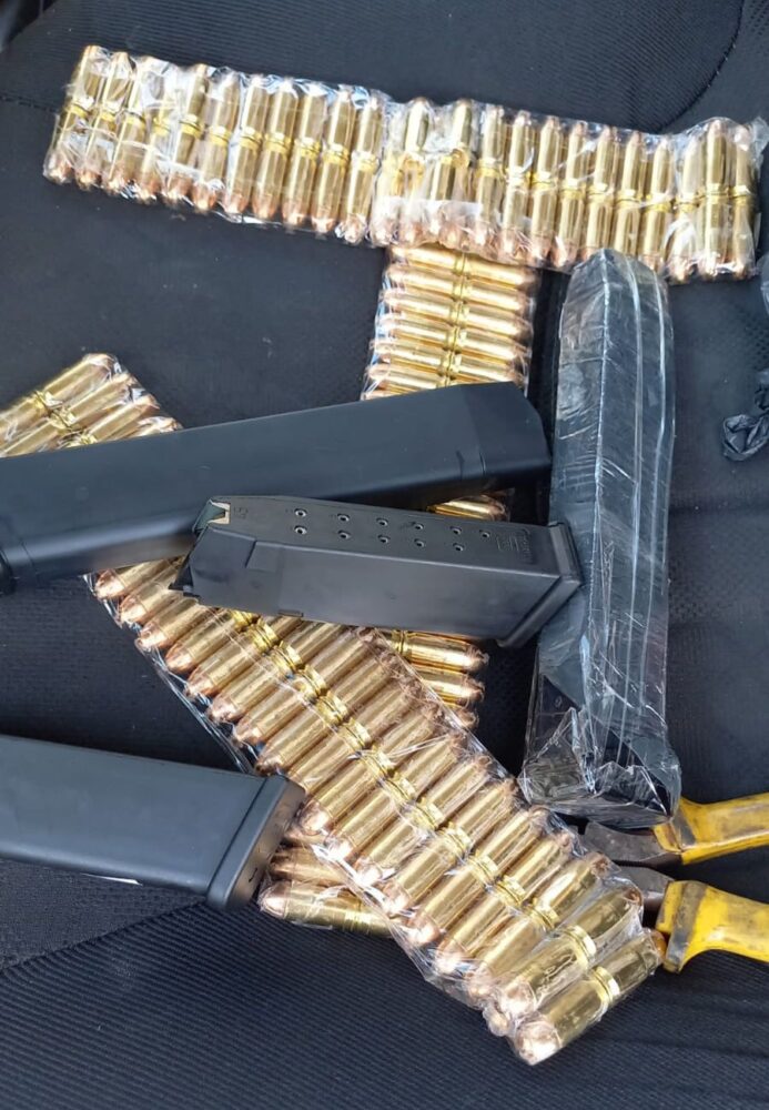 Durante revista pessoal nada de ilícito foi encontrado. Porém, em busca veicular, foi localizado um cofre oculto no painel, que continha três cartelas de munições .45, totalizando 150 munições e também quatro carregadores de pistola, sendo dois com capacidade para 13 munições e dois com capacidade para 25 munições.