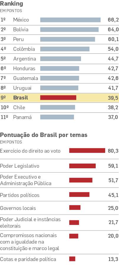 Dentre 192 países, o Brasil ocupa a 142ª posição do ranking internacional de participação de mulheres na política. A vizinha Argentina figura em vigésimo lugar nessa classificação, que é elaborada pela União Interparlamentar com base na composição dos parlamentos de cada país na esfera federal. Na América Latina, só o Haiti fica atrás do Brasil na lista, que foi atualizada em outubro.