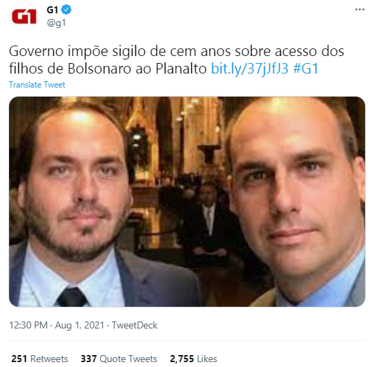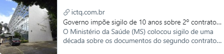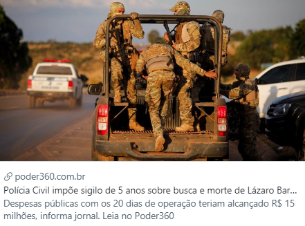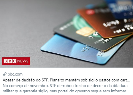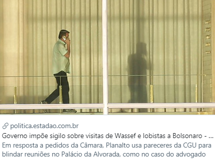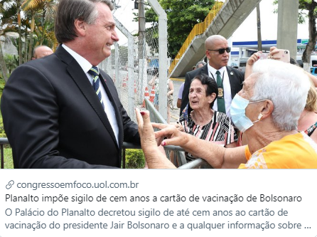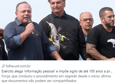 Eu estava esperando alguém fazer uma lista do que o governo considera assim tão sigiloso que a documentação ficará trancada por quase tanto tempo quanto deram pro Véio da Havan pagar suas dívidas (115 anos ). Felizmente o Robson Costa fez essa lista , que só cresce a cada dia. Quem pensava que Bolsonaro só escondia os gastos do seu cartão corporativo está muito enganado. Aqui outros sigilos impostos: