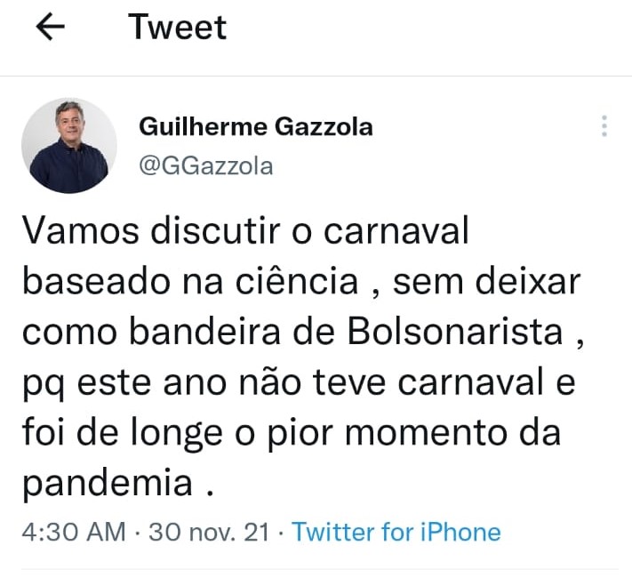 De madrugada, o prefeito Guilherme Gazzola postou em seu Twitter que a decisão sobre o Carnaval será baseada na ciência, e não como “bandeira de bolsonarista”. A grande ironia é que hoje o presidente Jair Bolsonaro se filiou ao mesmo partido do prefeito, o PL.