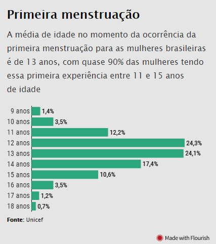Dados da ONU mostram que uma em cada dez meninas no mundo não vai às aulas durante o período menstrual. No Brasil, o dado é de uma a cada quatro! O que isso quer dizer? Que essas meninas perdem 45 dias de aula por ano. E, como meninas começam a menstruar em média com 13 anos, as perdas são ainda maiores. E isso causa evasão escolar.