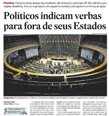 Como um preâmbulo, o primeiro furo de reportagem veio no fim de janeiro, quando revelamos no Estadão a liberação de R$ 3 bilhões pelo Ministério do Desenvolvimento Regional (MDR), a pedido de 285 deputados e senadores durante a negociação para as eleições do Congresso.