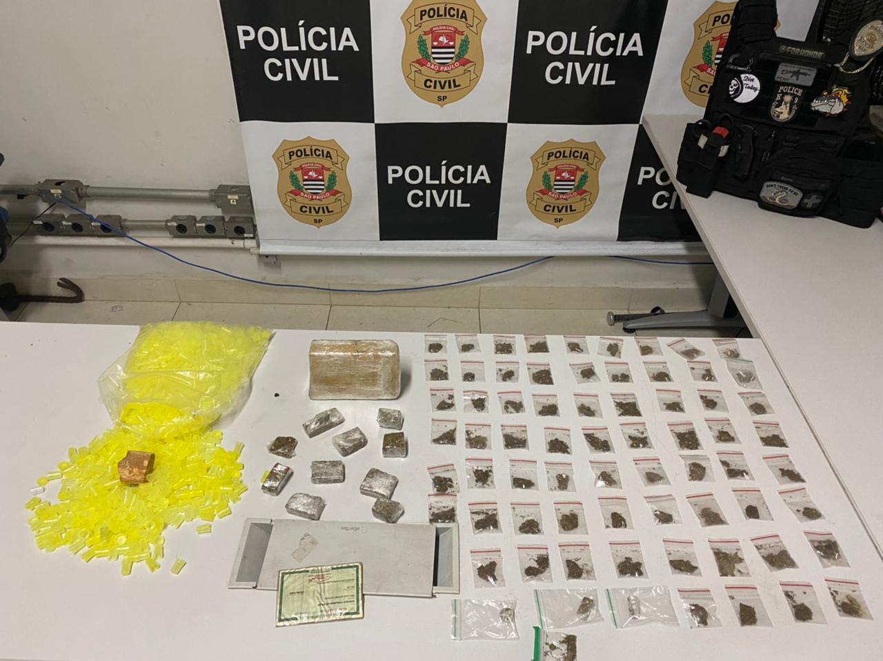 No interior do imóvel, foram localizadas mais 66 porções pequenas da mesma substância, mais dez porções pequenas de maconha, um tablete da mesma droga e uma pedra bruta de crack, além de centenas de cápsulas para armazenar entorpecentes vazias.