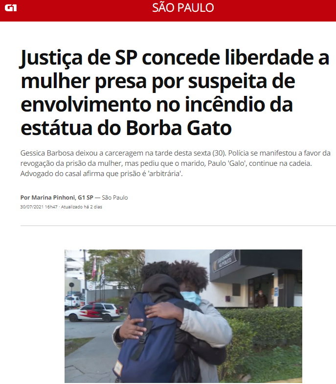 Nós que lutamos pela democracia neste país, temos a tarefa de mobilizar para que Galo e Gessica sejam libertados. É inaceitável que um criminoso como Borba Gato tenha uma estátua em uma das maiores capitais desse país e aqueles que lutam por uma mundo mais justo sejam detidos pelo estado.