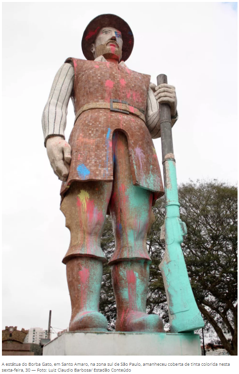 No mais recente protesto Fora Bolsonaro, realizado em várias cidades brasielras no dia 24 de julho, a horripilante estátua de 13 metros do bandeirante Borba Gato, em Santo Amaro, São Paulo, foi incendiada. Ela passa bem. Alguns dias depois, recebeu um pouco de tinta. Ficou menos feia. Mas não alivia o genocídio de indígenas e negros que ela representa.