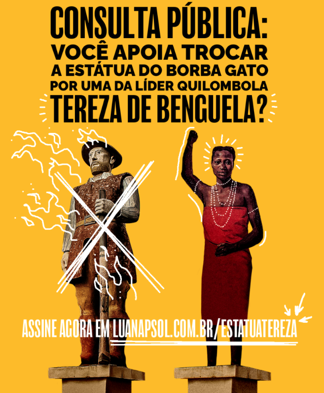 A discussão sobre heróis e heroínas que merecem ser homenageados continua, assim como o que é ou não vandalismo. Recomendo a assinatura do abaixo-assinado criado pela vereadora Luana (Psol-SP), que propõe substituir a estátua de Borba Gato por uma da líder quilombola Tereza de Benguela. Reproduzo este texto de Fran Rodrigues para o Juntos.