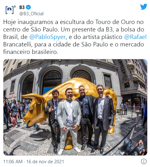 Terça-feira passada foi inaugurada no centro de São Paulo o “Touro de Ouro”, uma enorme estátua feita pelo artista plástico e arquiteto Rafael Brancatelli sob encomenda para a B3 (que, fiquei sabendo agora, antes se chamava Bovespa).