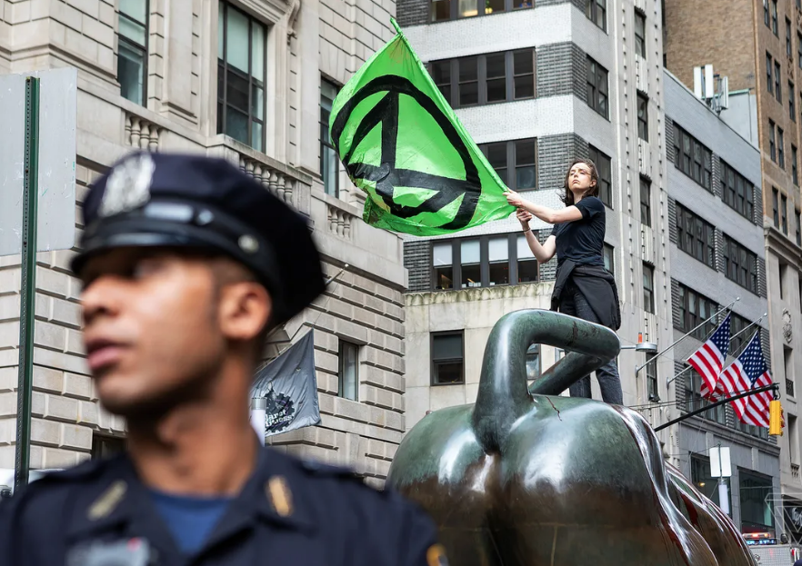 Em 2019, ambientalistas jogaram sangue falso no touro de Wall Street, e uma manifestante do grupo Extinction Rebellion ficou de pé na estátua com uma bandeira verde. O protesto reproduziu um cheque de vinte bilhões de dólares, simbolizando como o mercado financeiro tem subsidiado a indústria petroleira.